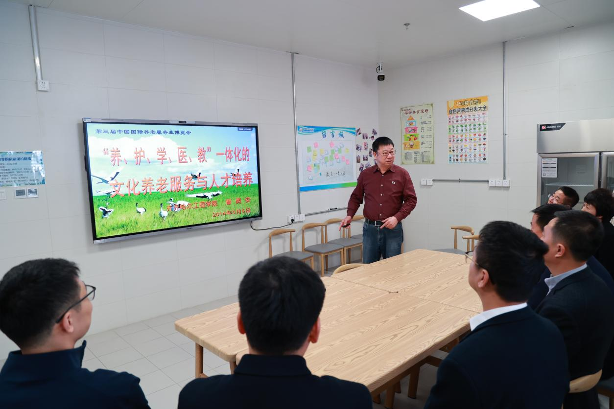 双方在学校知甘堂召开座谈交流会。创校校长、理事长曹勇安代表学校对考察团到来表示热烈欢迎,他简要介绍了学校“养、护、学、医、教”一体化的文化养老服务与人才培养,并阐述了智慧康养专业集群及智慧康养园区项目(筹建)的规划内容,指出,学校以服务“生态康养+智慧医养”产业集群为目标,以护理、食品科学、计算机、自动化及旅游管理等专业群为支撑,培养此类产业集群领域的专门人才。