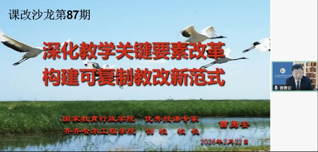 2月22日上午,创校校长、理事长曹勇安教授应邀做客第87期课改沙龙,在线作《深化教学关键要素改革,构建可复制教改新范式》专题报告。本次沙龙由应用型课程建设联盟主办,吸引了全国各院校 1500 余名教师云端参会互动,直播点赞量超 7000 人次。