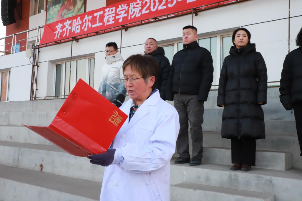 陈景鑫作总结讲话。她首先向全体师生致以新学期的问候与祝福,在回顾学校发展成果的同时,结合“爱自己”这一网络热词,向全体师生提出三点殷切希望:一是以德立身,做信仰坚定的齐工程人。要坚守人生底色,在奋斗中锤炼品格、砥砺意志;二是以能立业,做本领高强的应用型人才。要勤学善思、知行合一,不断提升专业素养与实践能力,主动对接社会发展需求;三是以声传情,做校园形象的优秀传播者。要积极讲好齐工程故事,传播校园正能量,让更多人了解学校、认同学校、热爱学校。她号召全体师生以梦为马、不负韶华,凝心聚力、奋发作为,共同书写学校高质量发展的崭新篇章。