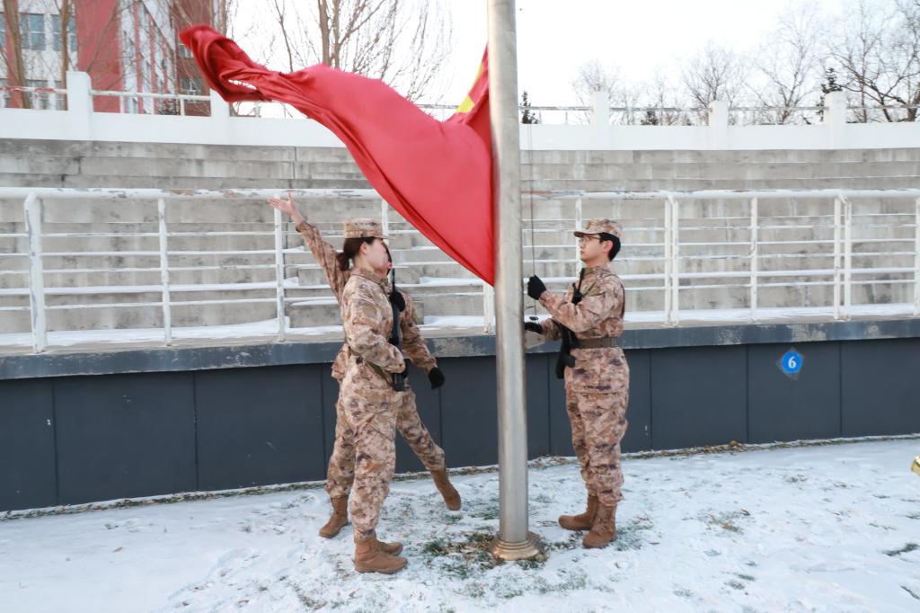 晨光熹微,随着《义勇军进行曲》的奏响,国旗在晨光中冉冉升起,全体师生面向国旗,庄严行礼,高唱国歌。