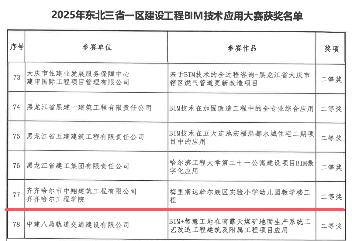 近日,东北三省一区2025年度建设工程BIM技术应用大赛结果揭晓,学校土木工程专业依托产业学院协同育人平台,联合合作企业打造的项目在众多成果中脱颖而出,斩获二等奖与优秀奖各一项,这一成绩充分展现了专业BIM技术教学实践的扎实功底,彰显了校企协同育人的显著成效。
