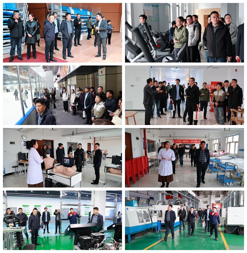 考察期间,周虎震一行在学校领导的陪同下参观学校产教融合基地和校内实践教学场所,实地走访了人民会堂、游泳馆、儿童健康管理中心、药食同源馆、健身馆、体育馆、冰上运动馆及大健康教育省级实验教学示范中心、新能源汽车实训中心、齐三机床等地,详细了解各场所的建设规模、功能定位、设备配置及教学应用情况,考察团对学校在产教融合创新、双创教育落地、微专业特色建设、社会服务赋能等方面取得的丰硕成果给予高度评价。