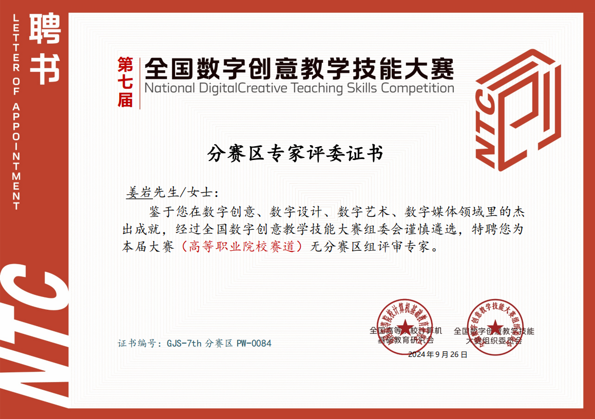 近日,全国数字创意教学技能大赛组委会在北京市正式公布了本届大赛(高等职业院校赛道)无分赛区组的评审专家名单。经过组委会的谨慎遴选和综合考虑,学校信息工程系视觉传达设计专业长姜岩、专业教师任杰被特聘为本次大赛的评审专家。