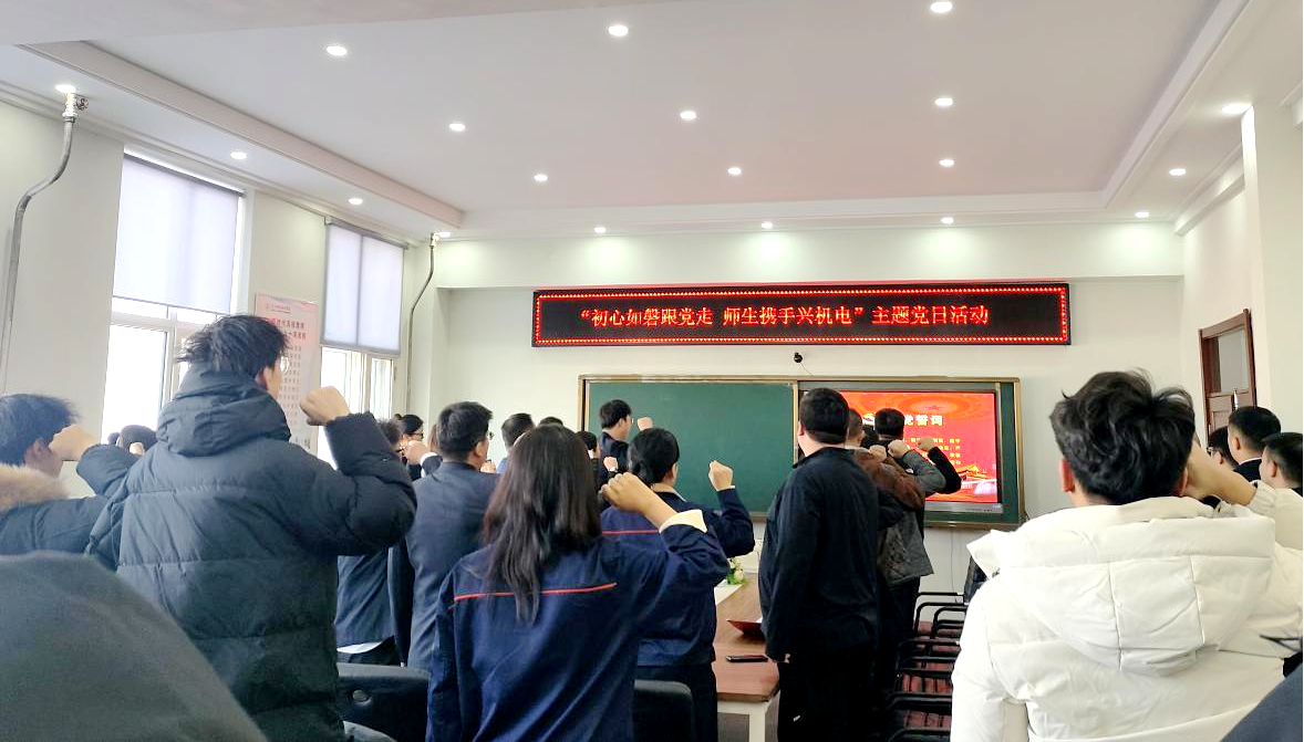 活动伊始,机电学院党委组织员吕嵩岩带领全体党员,面向党旗庄严宣誓。党员们列队整齐,右手握拳高举,铮铮誓言铿锵有力。重温入党誓词,全体党员进一步坚定了对党忠诚的政治品格,以及为党和人民的事业矢志不渝、接续奋斗的坚定信念。