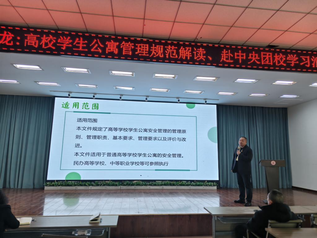 武装部部长、学生工作处副处长孙晓芳围绕《高等学校学生公寓管理规范》进行专题解读,他结合学校公寓管理实际,从规范适用范围、管理原则讲起,系统阐述公寓安全管理责任分工、工作要求、评价改进等核心内容,重点对消防安全、设施运维、值班巡查、隐患排查、应急处置等关键环节作出明确说明,清晰界定辅导员在公寓管理中的职责边界与工作要点,并针对特殊学生群体关爱、电动车安全、假期公寓管理等专项工作提出具体落实要求,推动公寓管理向标准化、规范化、精细化迈进。
