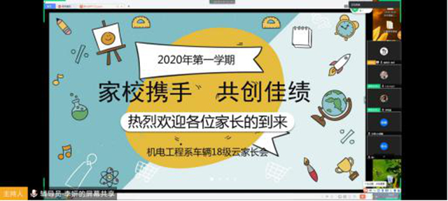 在会上的交流分享环节,学生代表车辆181班贾民强、车辆182班张子涵、车辆183班董新明,以连麦视频的方式依次分享了疫情防控期间居家的感受、对线上教学的适应情况、第四学期的感悟,倡导同学们积极面对疫情,做好科学防护,不信谣、不传谣,主动适应线上教学方式,以更好的状态投入线上课程学习。学生家长们也在会上交流分享了居家期教育孩子的方法和心得,纷纷表示将与学校紧密配合,以身作则,加强对孩子的疫情防控教育并关注孩子的学习。