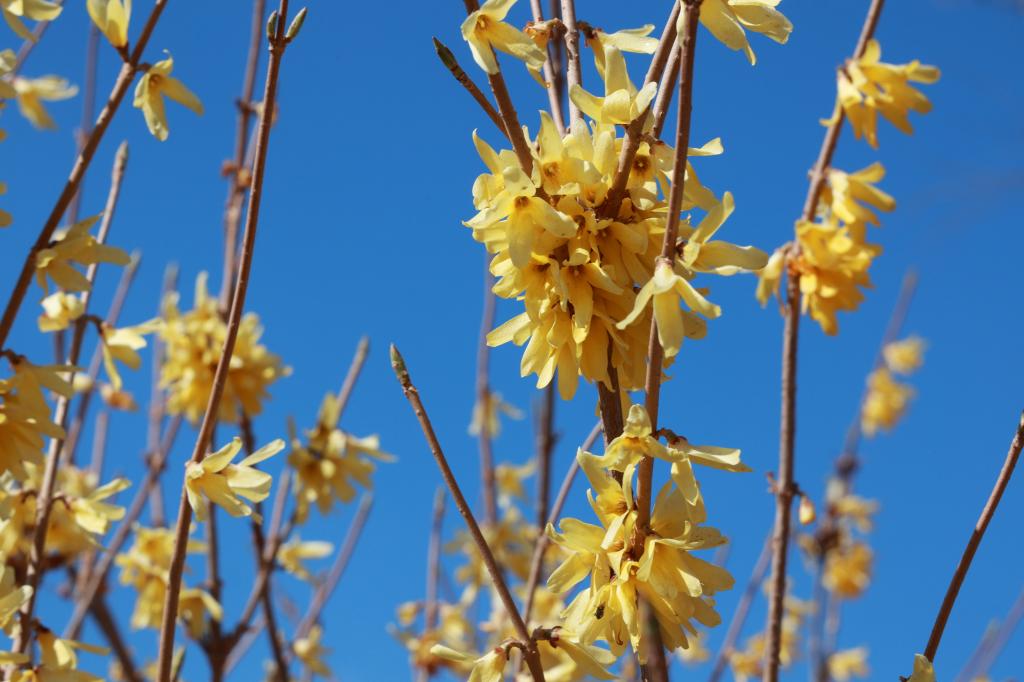 蓝天下,金黄色的连翘花在枝头摇曳