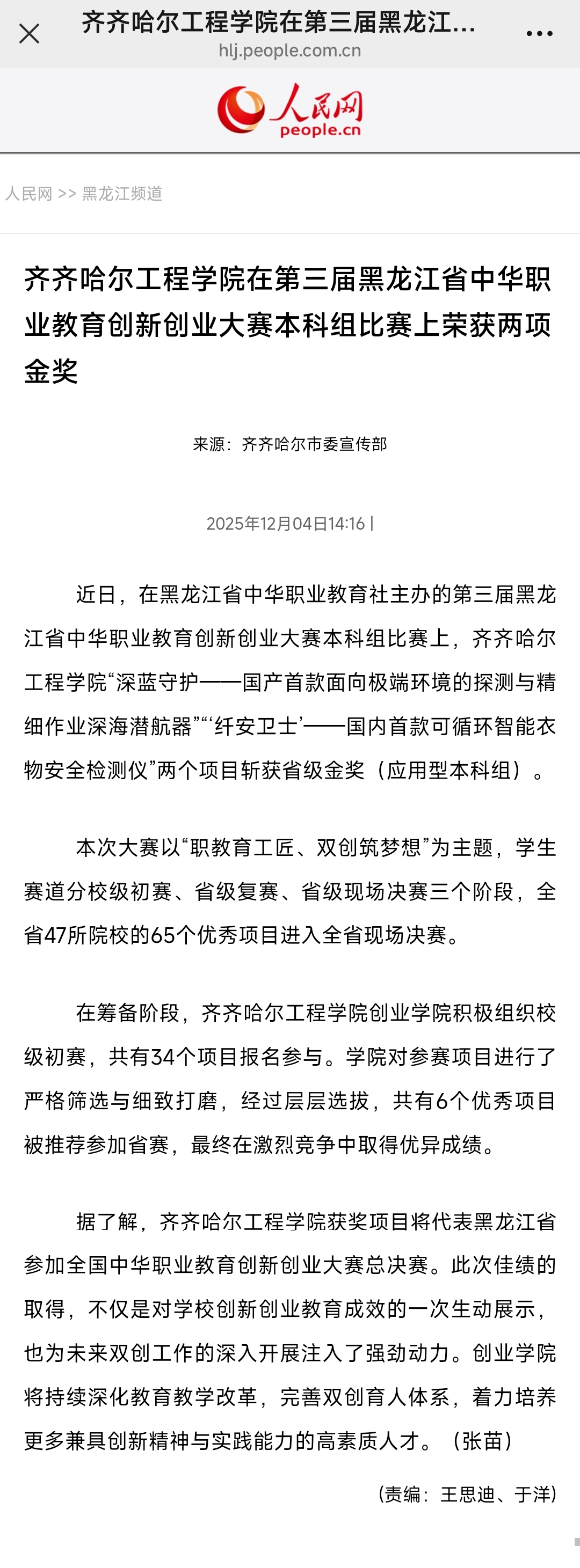 《人民网》齐齐哈尔工程学院在第三届黑龙江省中华职业教育创新创业大赛本科组比赛上荣获两项金奖