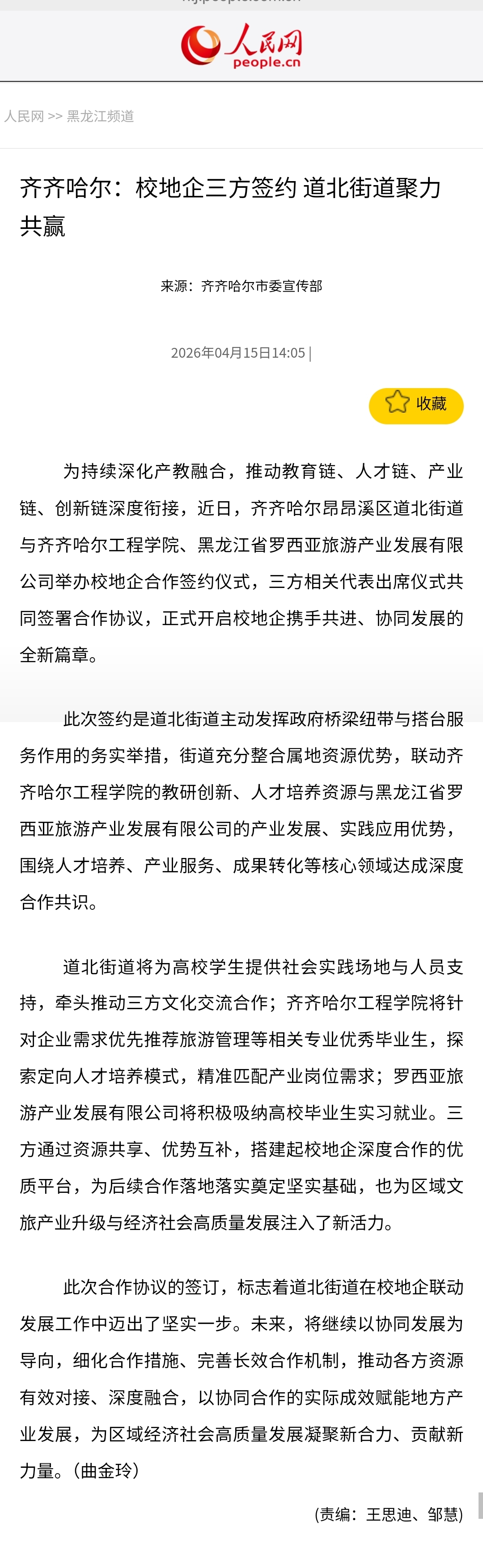 《人民网》齐齐哈尔:校地企三方签约道北街道聚力共赢