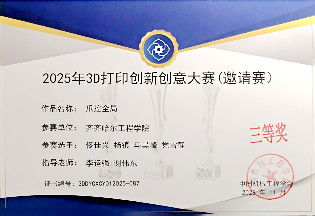 近日,2025年3D打印创新创意大赛全国总决赛在北京国家会议中心圆满落幕。由我校机电学院李运强、谢伟东老师指导,佟佳兴、杨镇、马昊峰、党雪静四名同学组成的“爪控全局”团队首次参赛且表现出色。他们凭借创新的设计方案与精彩的现场答辩,最终荣获全国总决赛三等奖,为学校赢得了荣誉。