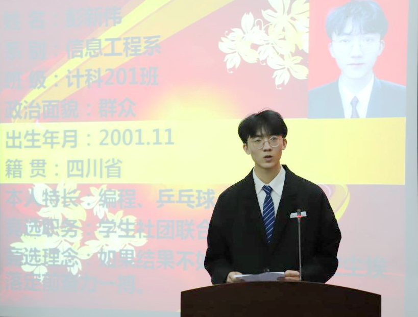学生社团联合会主席团成员投票结束后,第十一届学生社团联合会各部长参选人进行竞选陈述。几位竞选人员回顾了自己过往的工作和学习,并对社联未来发展提出自己的建议。