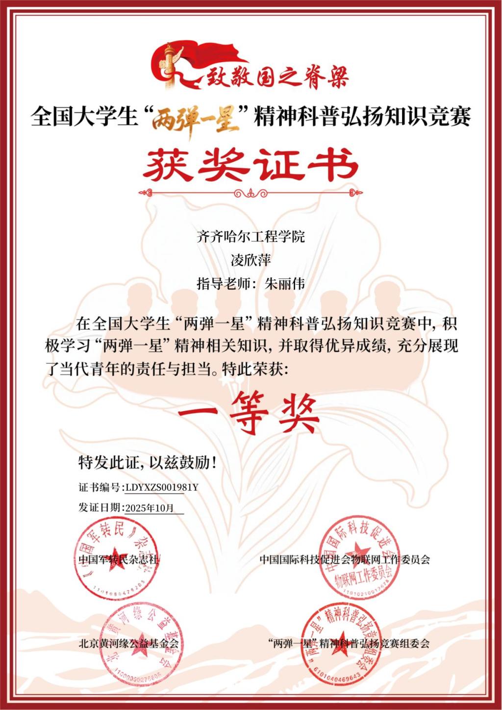 近日,由中国国史学会“两弹一星”历史研究分会学术指导的全国大学生“两弹一星”精神科普弘扬知识竞赛圆满落幕。通识教育学院大学物理教研室以课程思政建设为抓手,组织全校150名学子参赛。最终8名学子荣获一等奖、15名学生获得二等奖、30名学生获得三等奖,其余学生均获得优秀奖,展现了我校学子的家国情怀与科学素养。