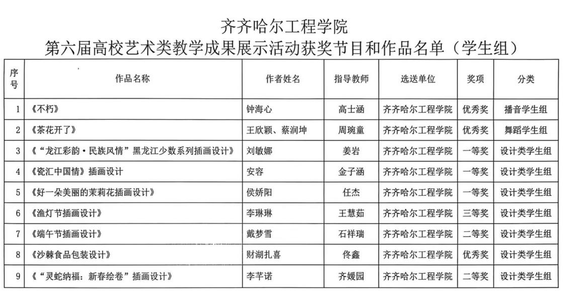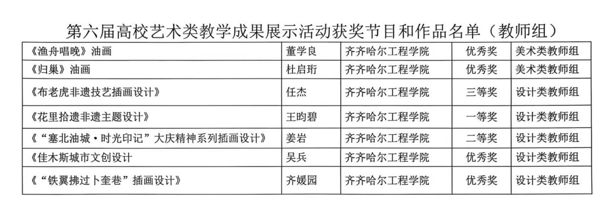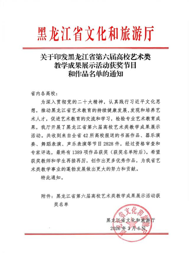 近日,黑龙江省文化和旅游厅印发《关于印发黑龙江省第六届高校艺术类教学成果展示活动获奖节目和作品名单的通知》。学校艺术与体育学院师生凭借扎实的专业功底与新颖的创作理念,在本次活动中斩获佳绩,共荣获一等奖4项、二等奖3项、三等奖2项、优秀奖7项。此次获奖数量与等级均创学院参赛以来历史新高,充分展现了学校艺术教育的扎实成效与丰硕成果。